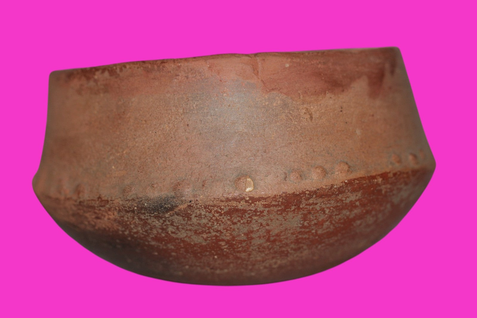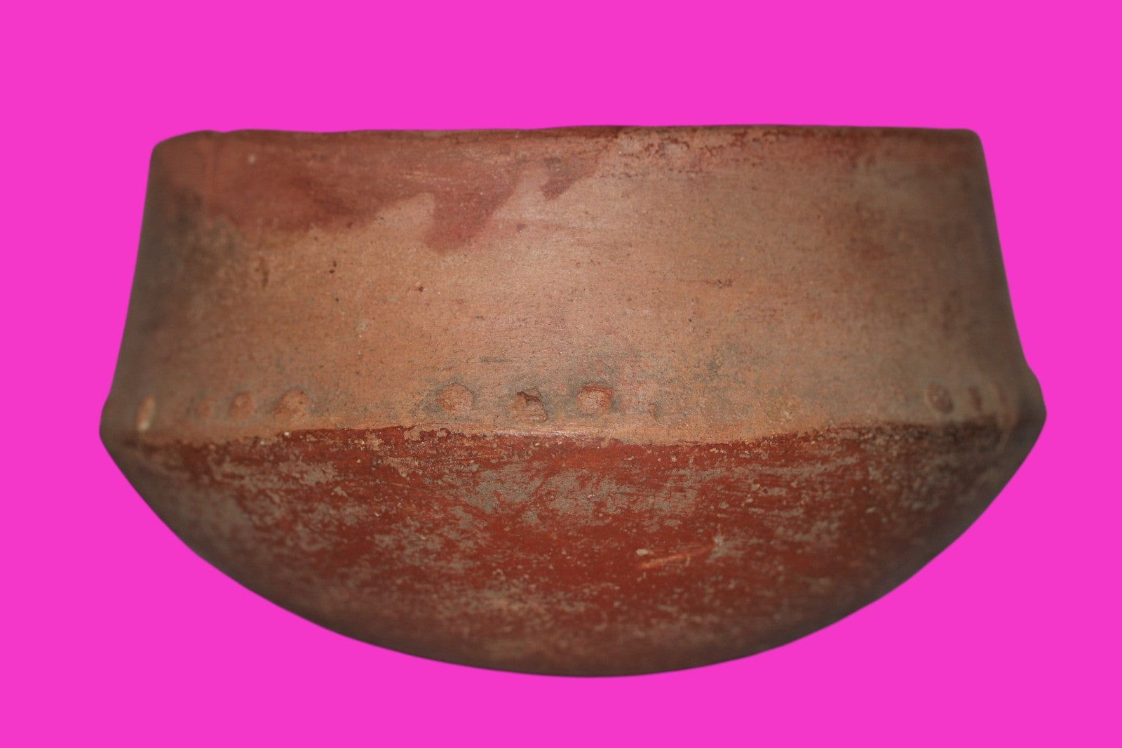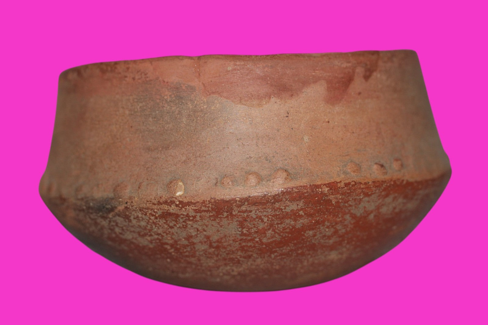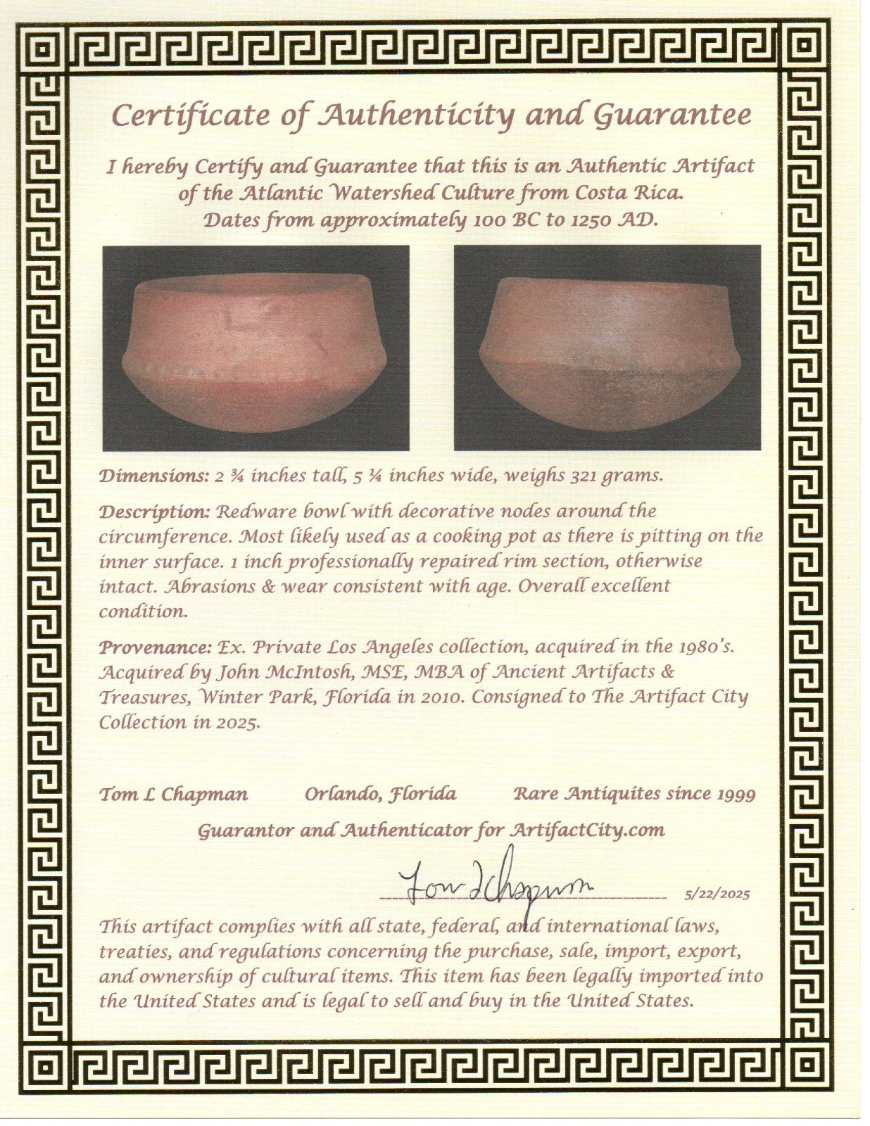 Dimensions: 2 ¾ inches tall, 5 ¼ inches wide, weighs 321 grams. Description: Redware bowl with decorative nodes around the circumference. Most likely used as a cooking pot as there is pitting on the inner surface. 1 inch professionally repaired rim section, otherwise intact. Abrasions & wear consistent with age. Overall excellent condition. Provenance: Ex. Private Los Angeles collection, acquired in the 1980’s. Acquired by John McIntosh, MSE, MBA of Ancient Artifacts & Treasures, Winter Park, Florida in 2010. Consigned to The Artifact City Collection in 2025.
