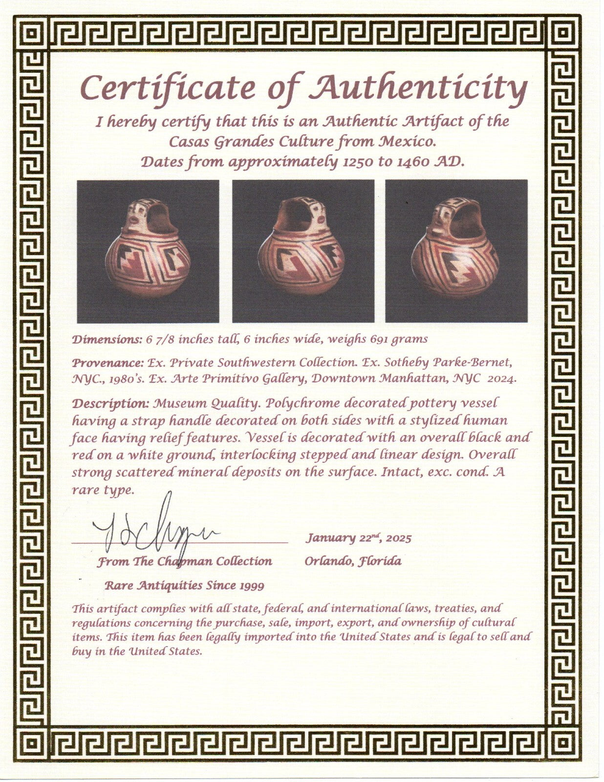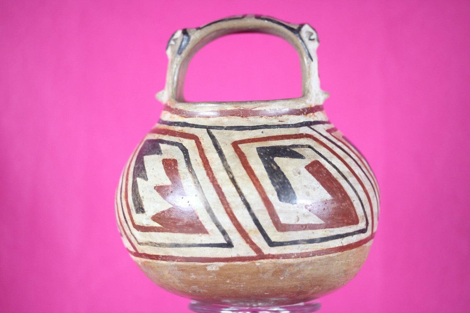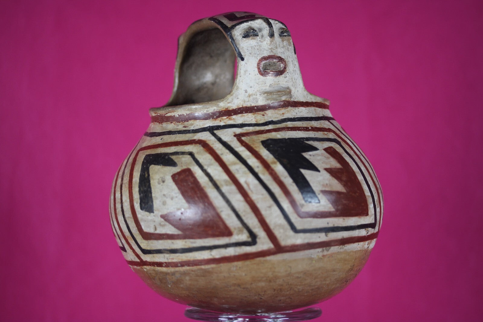 Museum quality. Museum Quality. Polychrome decorated pottery vessel having a strap handle decorated on both sides with a stylized human face having relief features. Vessel is decorated with an overall black and red on a white ground, interlocking stepped and linear design. Overall strong scattered mineral deposits on the surface. Intact, exc. cond. A rare type.