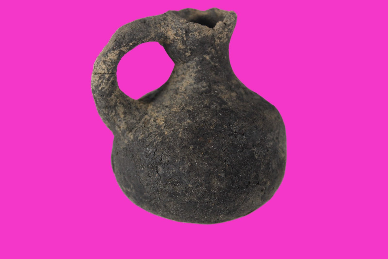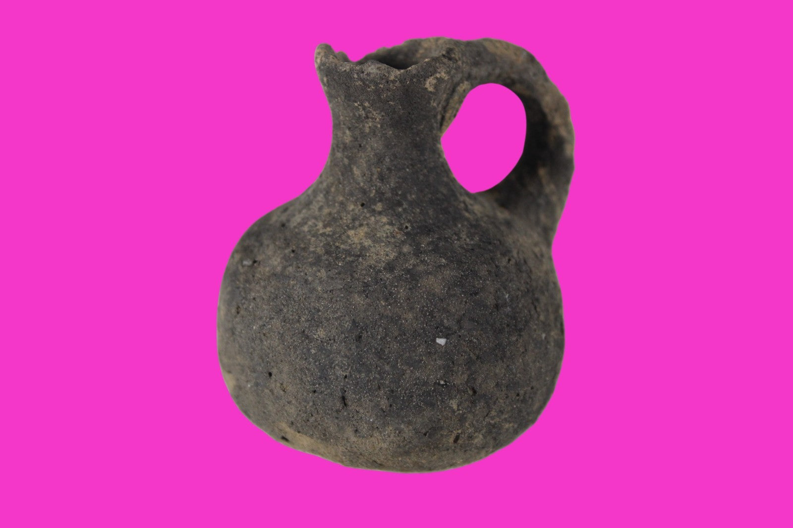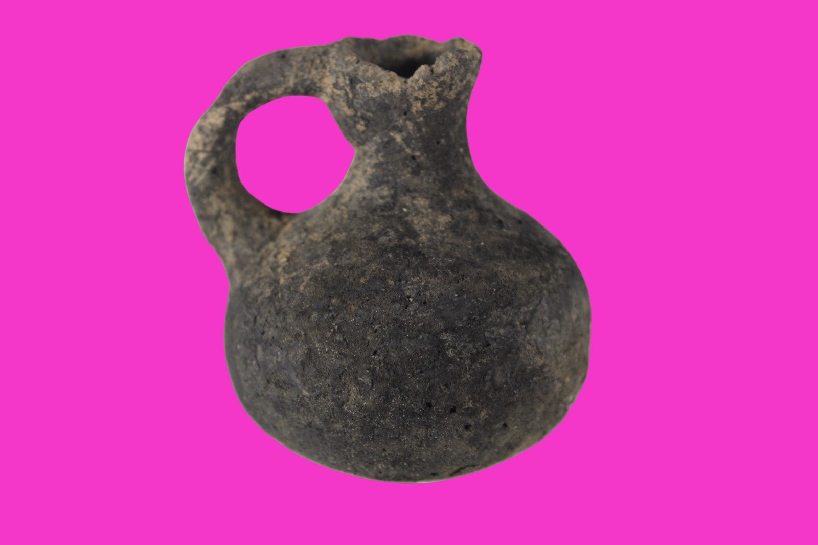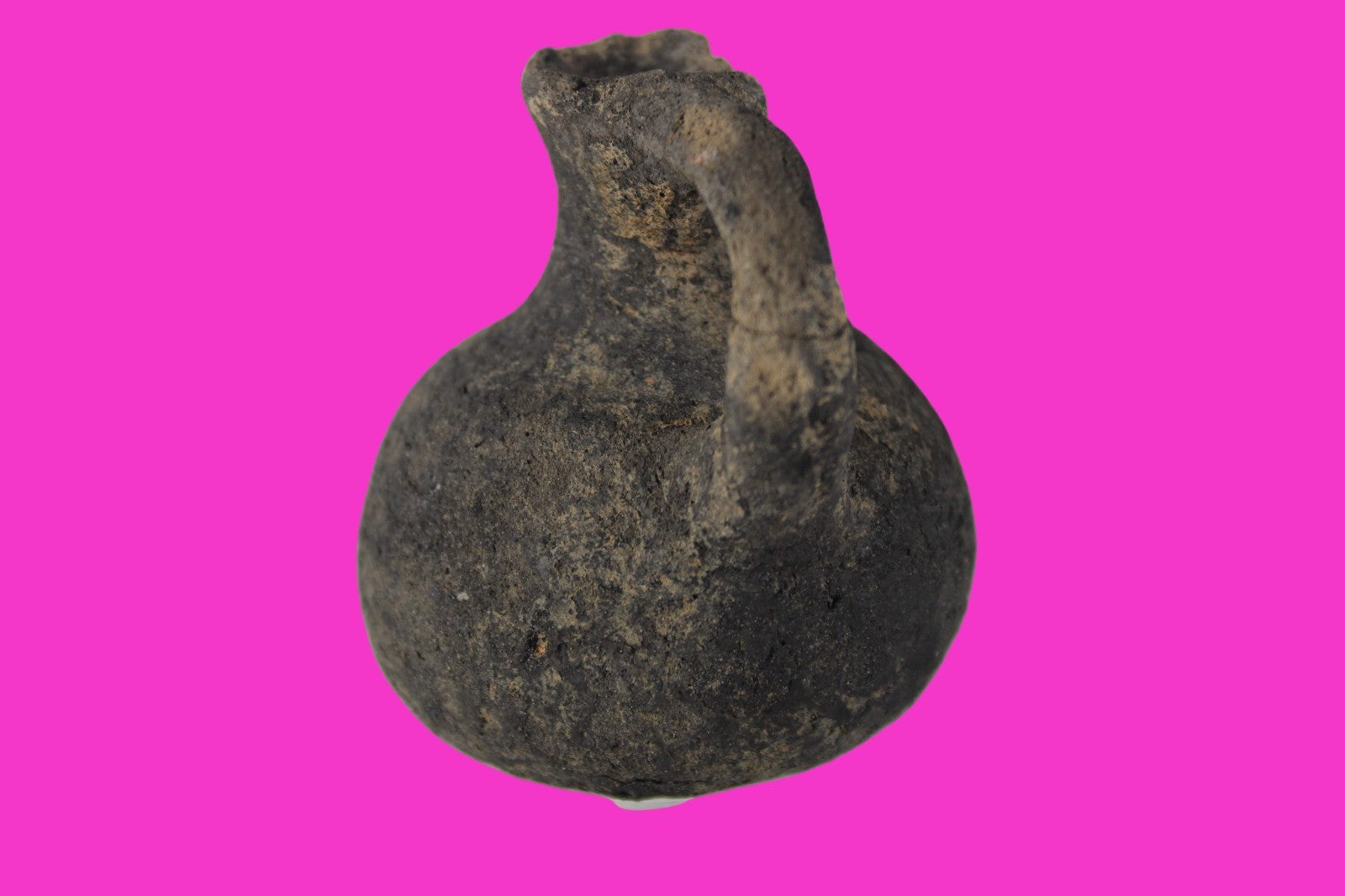 Dimensions: 2 ½ inches tall, 2 inches wide, weighs 43 grams Provenance: Ex private Nevada collection, discovered in the aftermath of the 1967 6 day war. Acquired by The Artifact City Collection in 2025. Description: Blackware terra cotta jug. Mineral deposits indicative of approximately 3000 years of underground burial. Small rim chips and surface loss. No repairs or restorations found. Overall Outstanding condition. King David is often looked upon as the most successful military conqueror in the history of the Israelite nation. By the end of his reign in 971 BC, the boundaries of Israel and the neighboring vassal kingdoms who paid tribute to David stretched across the Fertile Crescent from the Wadi of Egypt to the River Euphrates.