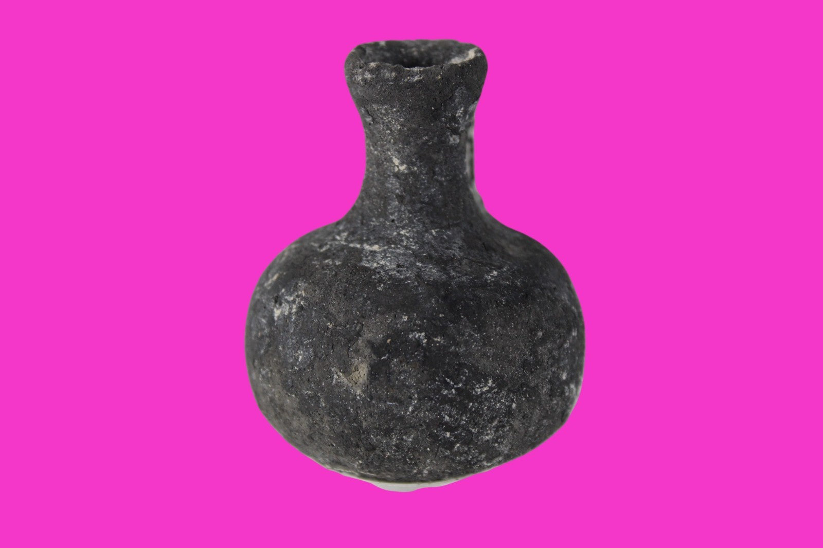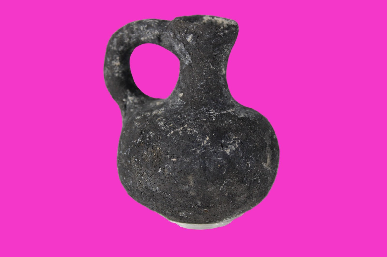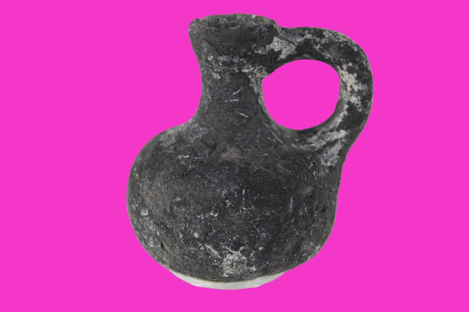 Dimensions: 2 ¾ inches tall, 2 ¼ inches wide, weighs 59 grams Provenance: Ex private Nevada collection, discovered in the aftermath of the 1967 6 day war. Acquired by The Artifact City Collection in 2025. Description: Blackware terra cotta jug. Mineral deposits indicative of approximately 3000 years of underground burial. Small rim chips and surface loss. Top of spout repaired, possibly an ancient repair. Outstanding condition. King David is often looked upon as the most successful military conqueror in the history of the Israelite nation. By the end of his reign in 971 BC, the boundaries of Israel and the neighboring vassal kingdoms who paid tribute to David stretched across the Fertile Crescent from the Wadi of Egypt to the River Euphrates.