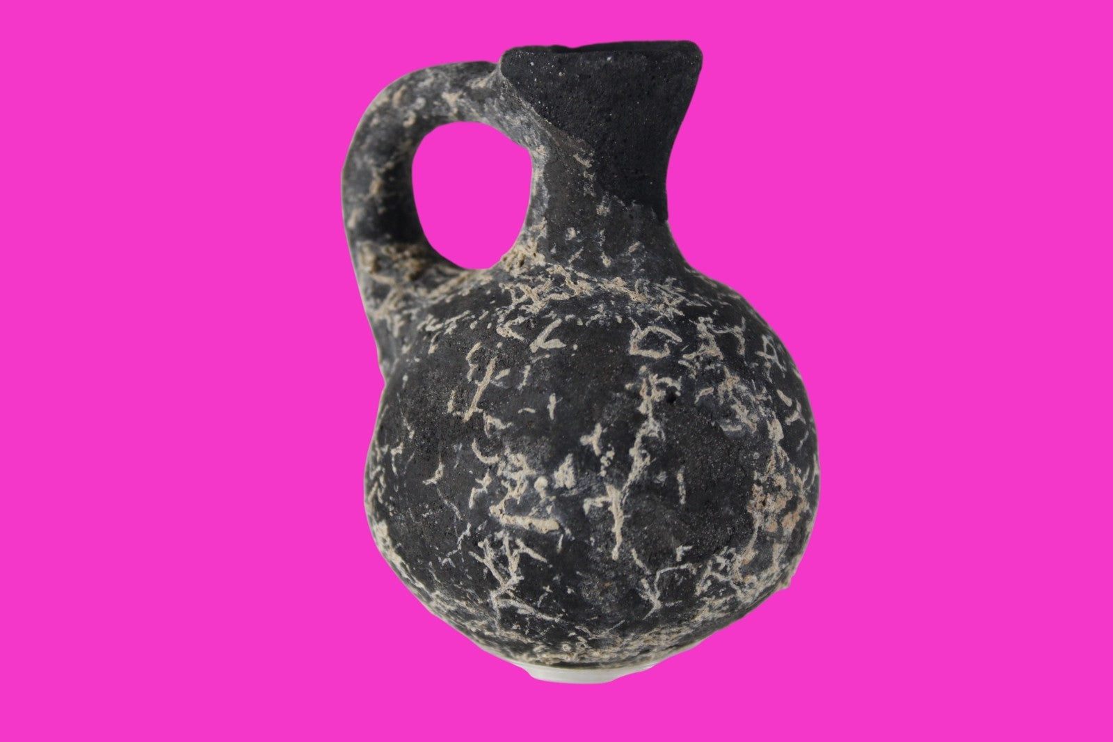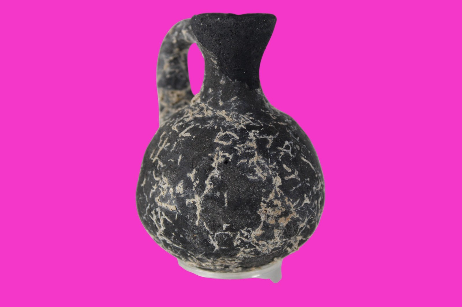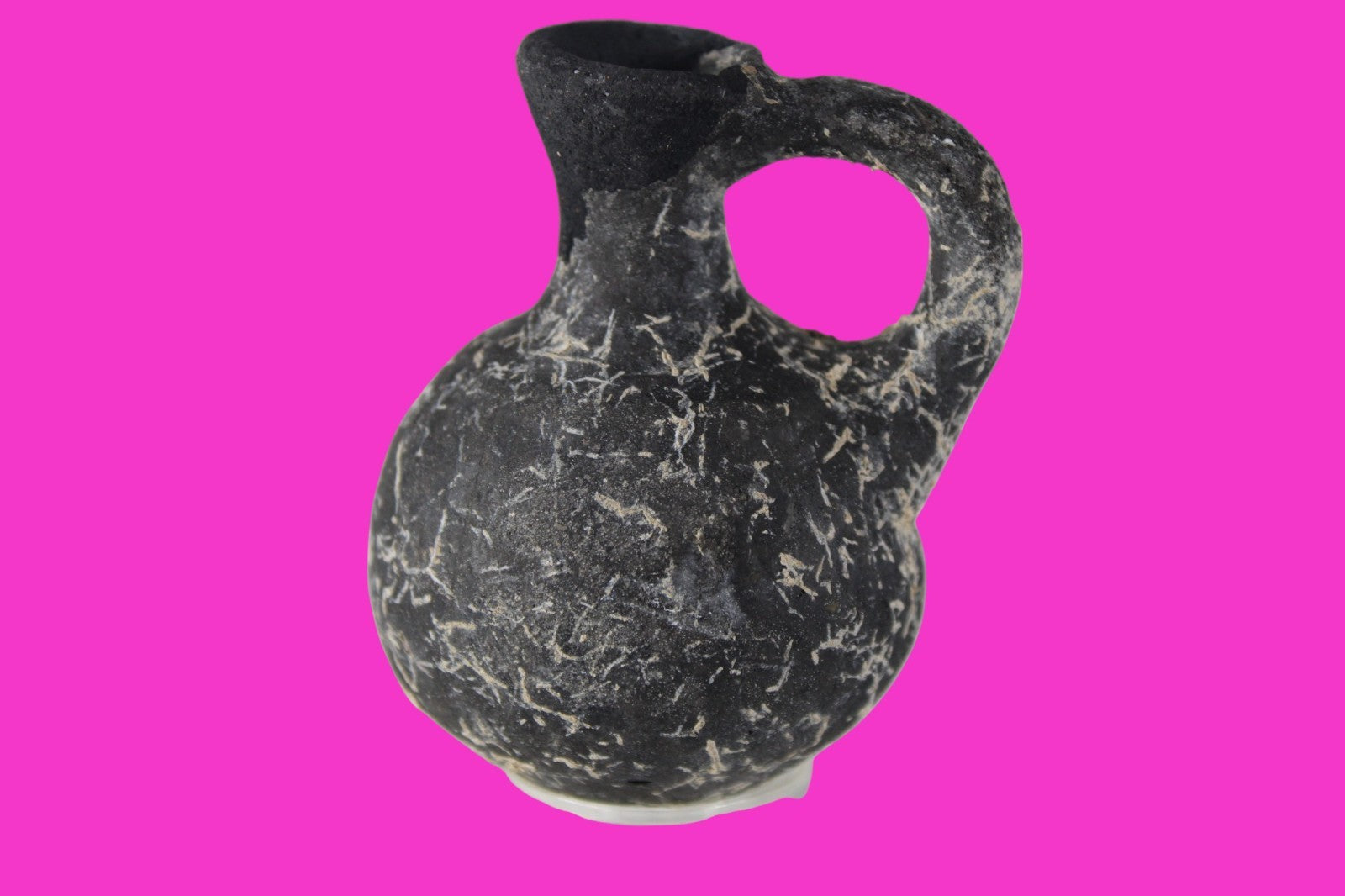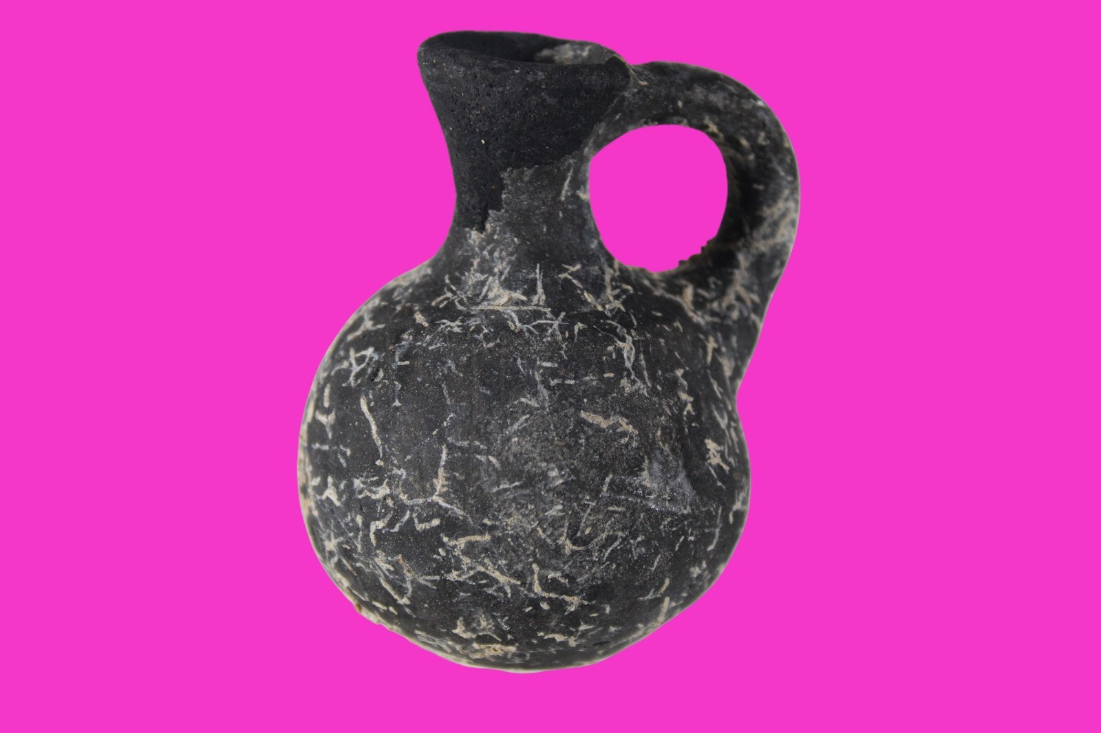 Dimensions: 3 inches tall, 2 ¼ inches wide, weighs 73 grams Provenance: Ex private Nevada collection, discovered in the aftermath of the 1967 6 day war. Acquired by The Artifact City Collection in 2025. Description: Blackware terra cotta jug. Mineral deposits indicative of approximately 3000 years of underground burial. Small rim chips and surface loss. Top of spout repaired, possibly an ancient repair. Outstanding condition. King David is often looked upon as the most successful military conqueror in the history of the Israelite nation. By the end of his reign in 971 BC, the boundaries of Israel and the neighboring vassal kingdoms who paid tribute to David stretched across the Fertile Crescent from the Wadi of Egypt to the River Euphrates.