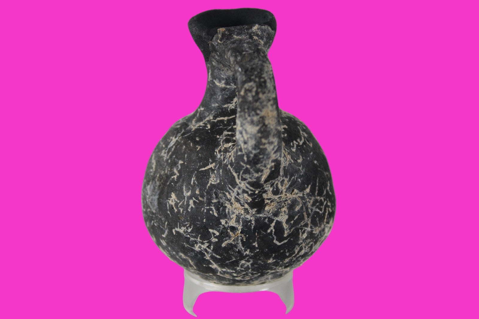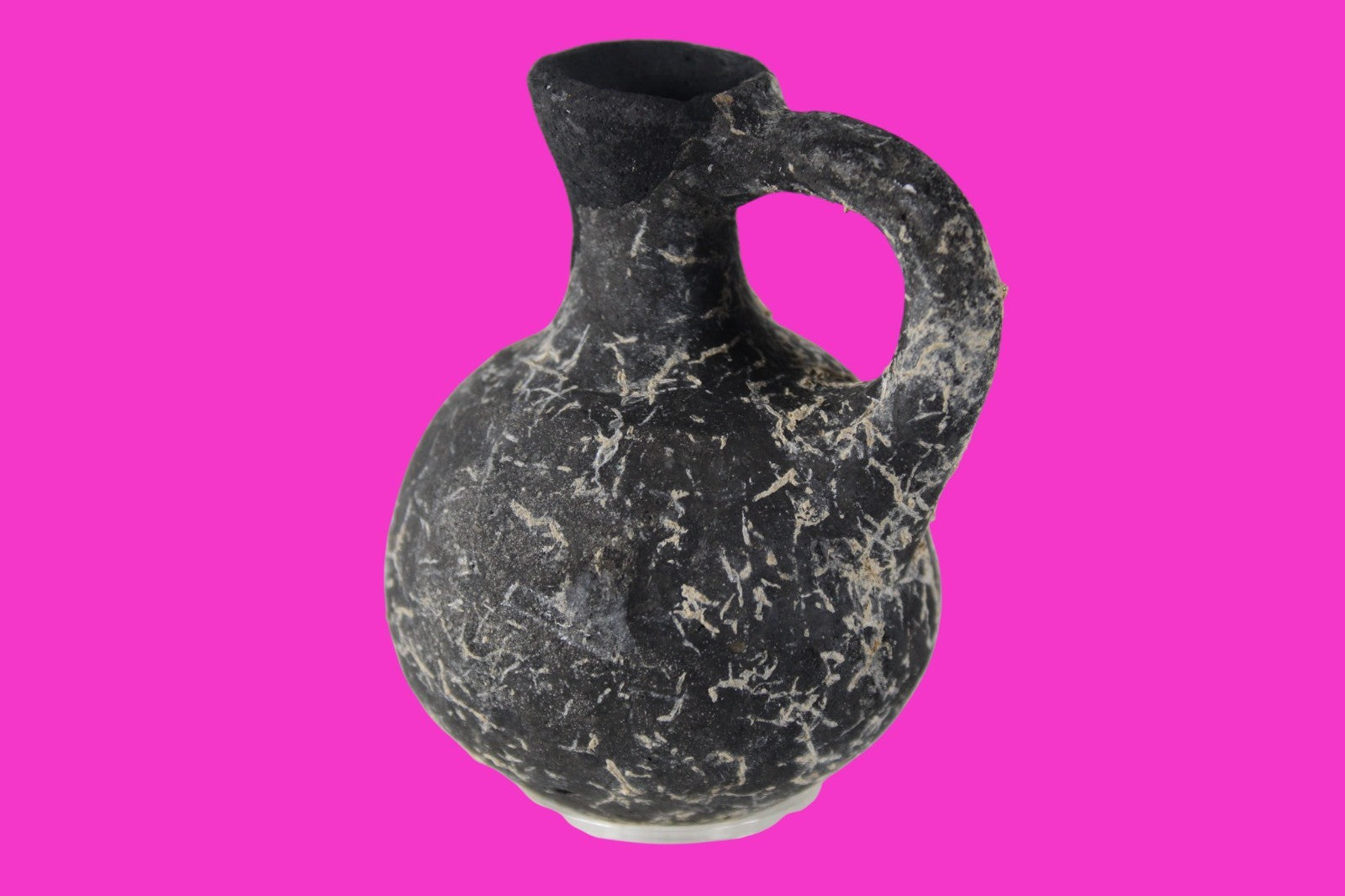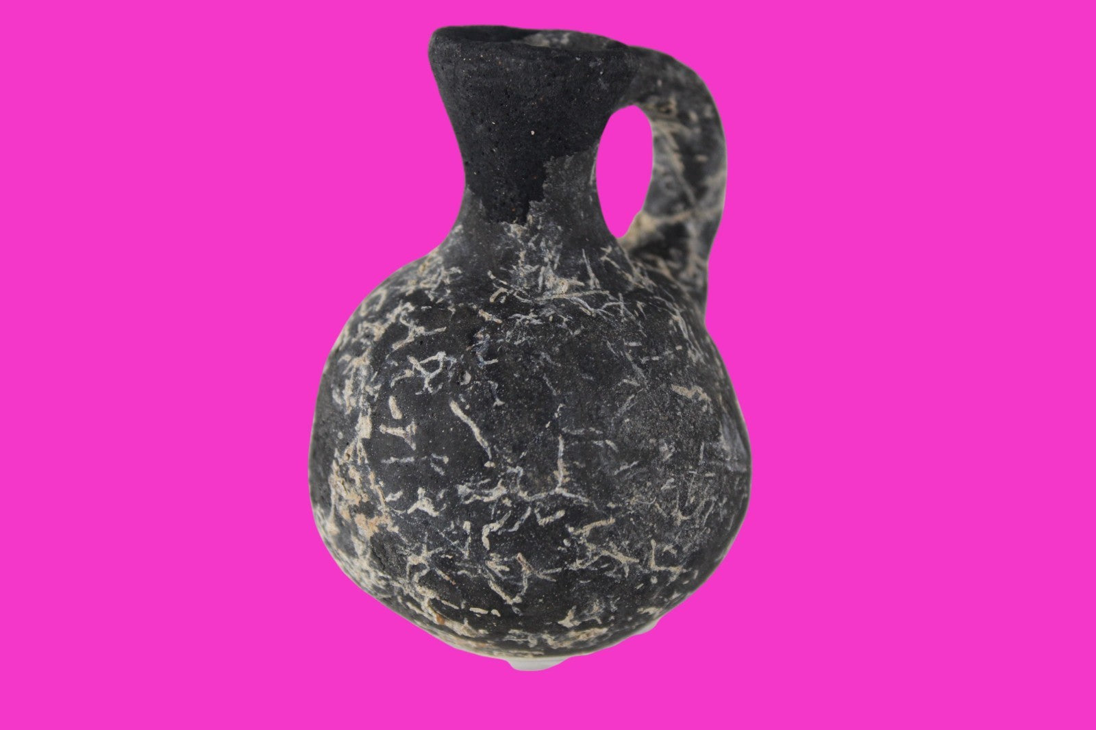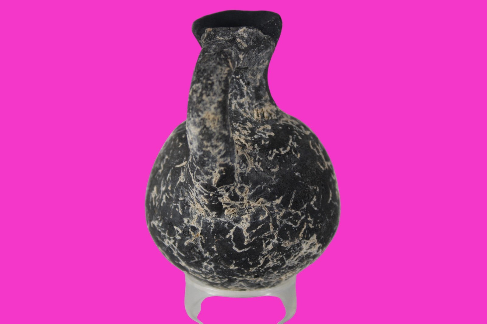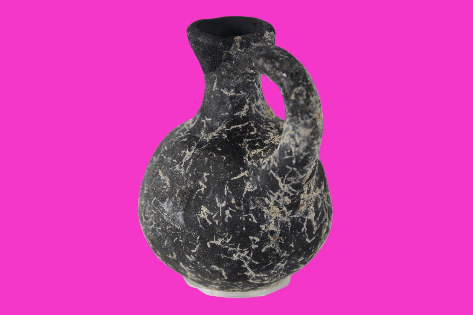Dimensions: 3 inches tall, 2 ¼ inches wide, weighs 73 grams Provenance: Ex private Nevada collection, discovered in the aftermath of the 1967 6 day war. Acquired by The Artifact City Collection in 2025. Description: Blackware terra cotta jug. Mineral deposits indicative of approximately 3000 years of underground burial. Small rim chips and surface loss. Top of spout repaired, possibly an ancient repair. Outstanding condition. King David is often looked upon as the most successful military conqueror in the history of the Israelite nation. By the end of his reign in 971 BC, the boundaries of Israel and the neighboring vassal kingdoms who paid tribute to David stretched across the Fertile Crescent from the Wadi of Egypt to the River Euphrates.